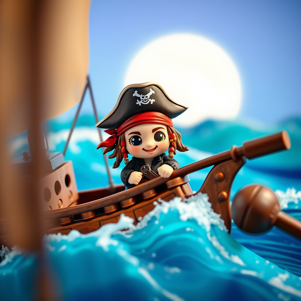 Adventurous mini pirate with quirky charm, wearing a tiny tricorn hat, beads in his hair, and a mischievous grin, swashbuckling on a toy-sized wooden ship amidst vibrant ocean waves, reminiscent of a chibi Jack Sparrow.