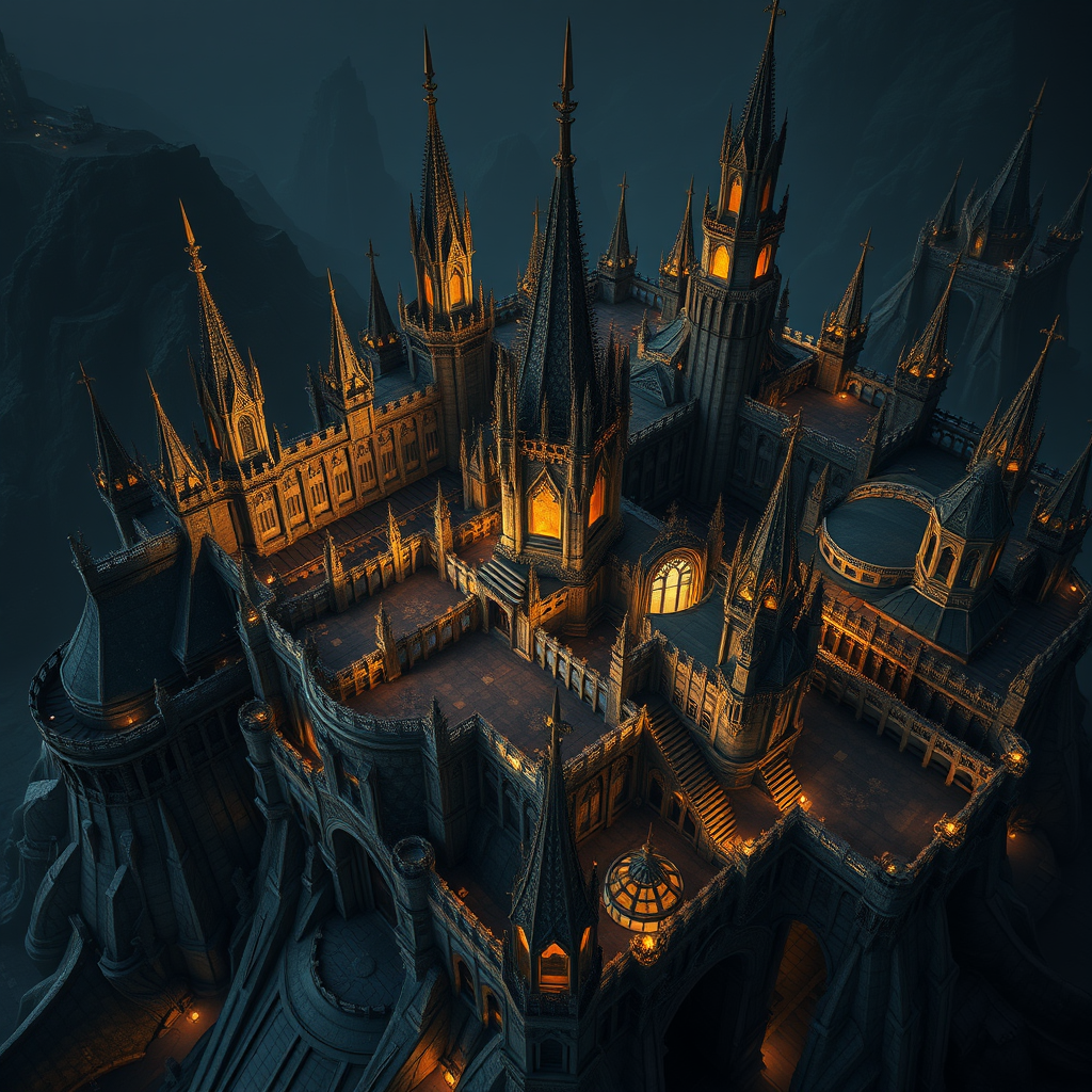 Aerial perspective of an intricately detailed colossal imperial fortress, set in a mystical dark fantasy realm, showcasing complex architecture with a labyrinthine design, bathed in ethereal twilight with volumetric lighting; hyperrealistic textures and photorealistic details create an otherworldly yet tangible experience, where shadows play across vast battlements and elaborate spires, capturing the majesty and mystique of an enigmatic, otherworldly sanctuary, set within a grandiose landscape that enhances its majestic maximalism.