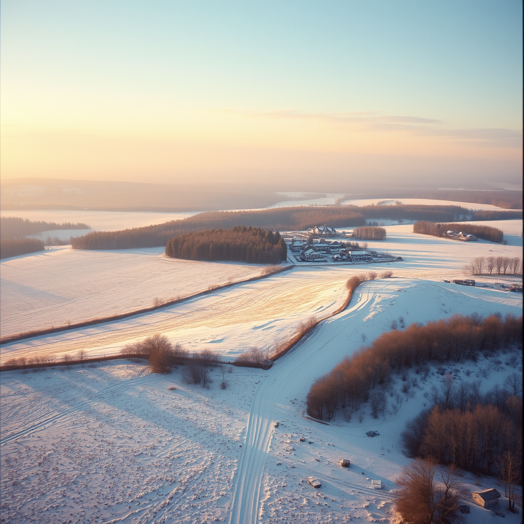 Aerial photo capturing a serene winter landscape, a snow-covered field adjacent to a quaint village, infused with a warm color palette and gentle film grain reminiscent of Kodak Portra. The scene evokes a nostalgic warmth and tranquility, highlighting the delicate balance between nature and human habitation under a softly illuminated sky.