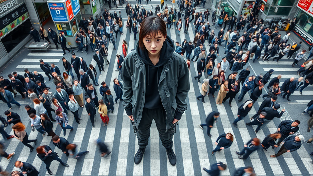 Aerial photograph capturing a Korean model standing confidently at the heart of a sprawling, intricate crosswalk reminiscent of the iconic Shibuya scramble. The model gazes directly into the camera, exuding a cool demeanor. She is clad in a sleek techwear ensemble featuring a black washed safari jacket layered over a thick black hoodie, complemented by black washed cargo joggers and dark grey tactical boots. The bustling crowd surrounding her creates a dynamic backdrop, accentuating the model’s striking presence. The composition emphasizes a high contrast, raw aesthetic, capturing the essence of urban style and movement.