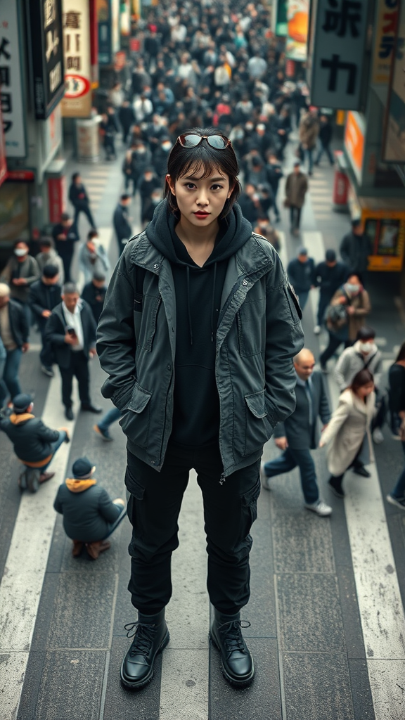Aerial photography captures a striking image of a Korean model in a bustling, intricate crosswalk reminiscent of Shibuya scramble. She stands confidently, gazing directly into the camera, dressed in a sleek black techwear ensemble. Her outfit includes a washed safari jacket over a thick black hoodie, paired with black cargo jogger pants. Dark grey tactical boots complete her look, blending seamlessly with the urban crowd around her. The atmosphere is dynamic, with a sense of movement and energy in the crowded street, captured in a raw, unfiltered style.