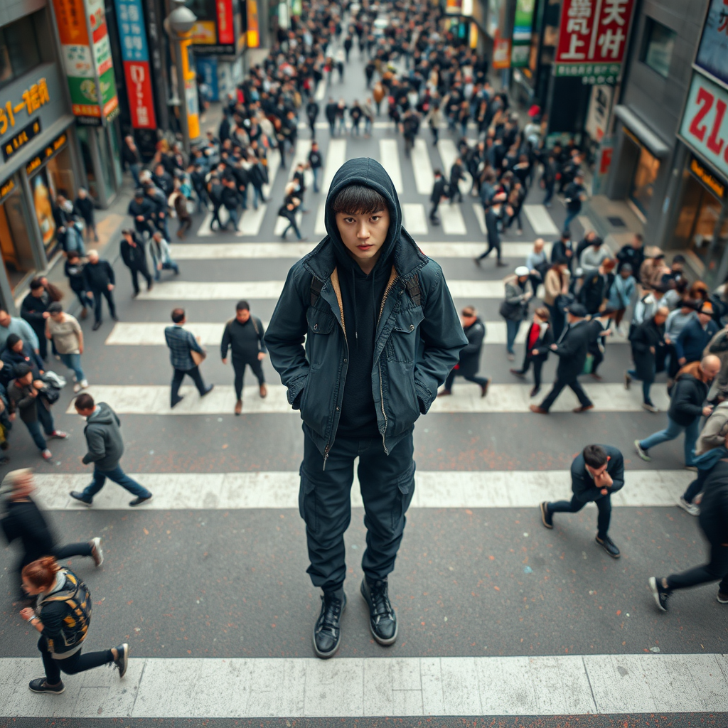 Aerial shot capturing a Korean model at the heart of an intricate crosswalk inspired by the Shibuya Scramble, gazing intently at the camera. The model is dressed in a black techwear safari jacket layered over a thick black hoodie, paired with black cargo joggers, and wearing dark grey tactical boots. Surrounded by a bustling crowd, the scene is vivid and dynamic, emphasizing the street's energy and the model's striking presence.