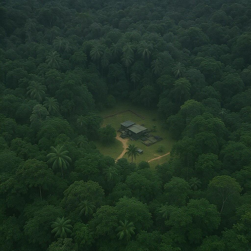 Aerial surveillance image capturing a hidden military outpost nestled deep within a dense, lush rainforest, surrounded by a thick canopy of towering trees, with camouflaged structures barely visible under the foliage, and narrow dirt paths weaving through the greenery, hinting at covert activities in the midst of nature's untouched wilderness.