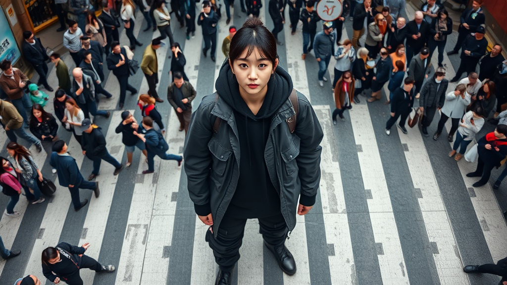 Aerial view capturing a Korean model in the center of a complex crosswalk reminiscent of Shibuya Scramble, gazing confidently into the camera. She dons a sleek, techwear-inspired ensemble featuring a black washed safari jacket layered over a thick black hoodie, paired with black cargo jogger pants. Her look is completed with dark grey tactical boots. Surrounding her is a bustling crowd, creating a dynamic contrast. The scene is vivid and raw, highlighting urban fashion against the backdrop of the energetic city intersection.