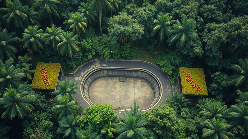 Aerial view of a brutalist concrete skatepark nestled within the dense greenery of the Amazon rainforest, encircled by moss-covered, abandoned structures exuding an air of isolation, captured with the nostalgic grain of analog film on a Leica camera, bathed in gentle, diffused light.