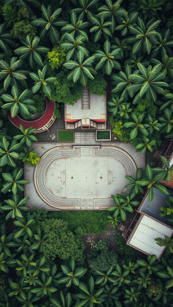 Aerial view of a brutalist concrete skatepark nestled within the dense foliage of the Amazon jungle, surrounded by derelict structures, exuding a sense of loneliness, captured in the style of analog photography using a Leica camera, bathed in gentle, diffused light.