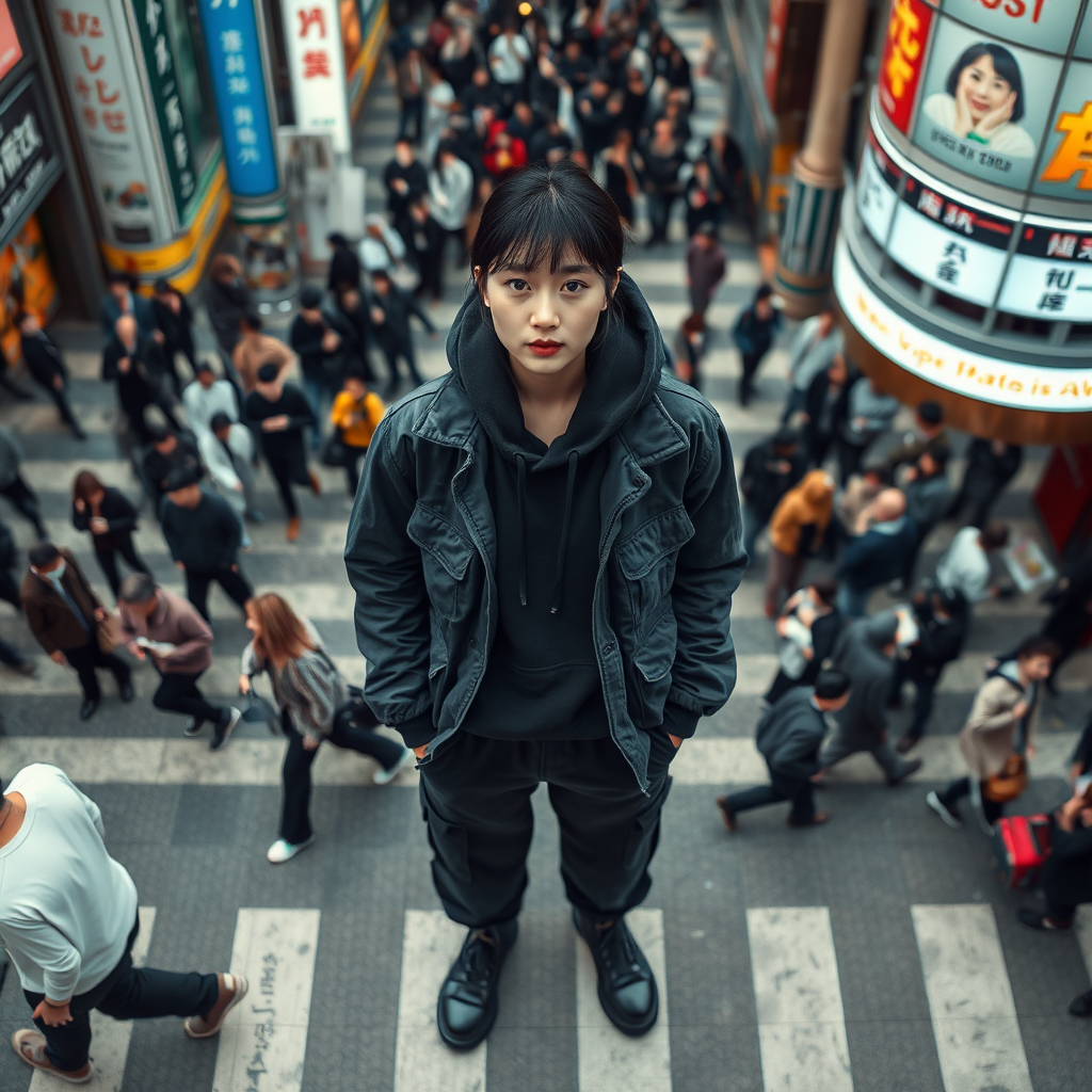 Aerial view of a Korean model standing at the heart of a complex crosswalk similar to Shibuya Scramble, engaging directly with the camera. She is dressed in a sleek techwear ensemble: a black washed safari jacket layered over a thick black hoodie, paired with black washed cargo jogger pants and dark grey tactical boots. The bustling crowd around her adds dynamic energy to the scene, all captured in a raw, authentic style.