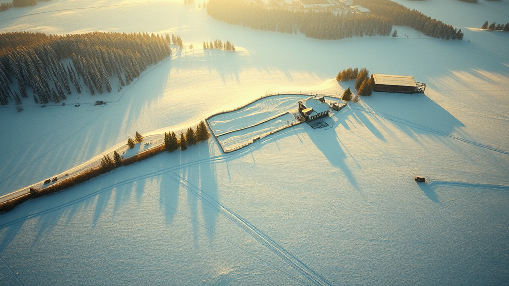 Aerial view of a snowy field adjacent to a tiny village, featuring a subtle film grain effect reminiscent of a classic Kodak Portra photo. The scene is bathed in a warm, golden color palette, with gentle sunlight casting long shadows over the landscape. The composition is balanced with a focus on the interplay between the crisp, white snow and the hints of muted greenery peeking through, all enclosed in a timeless 4:5 aspect ratio.