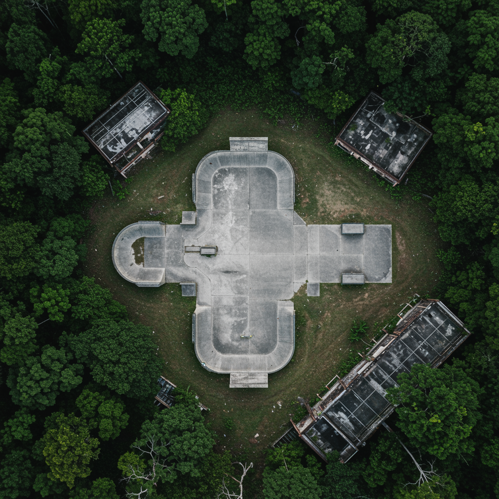 Aerial view of a stark brutalist concrete skatepark nestled amidst the lush expanse of the Amazon rainforest, surrounded by decaying and overgrown abandoned structures, evoking a sense of isolation and tranquility, captured in the nostalgic grain of analog photography with a Leica camera, softened by gentle, diffused lighting that filters through the dense canopy.