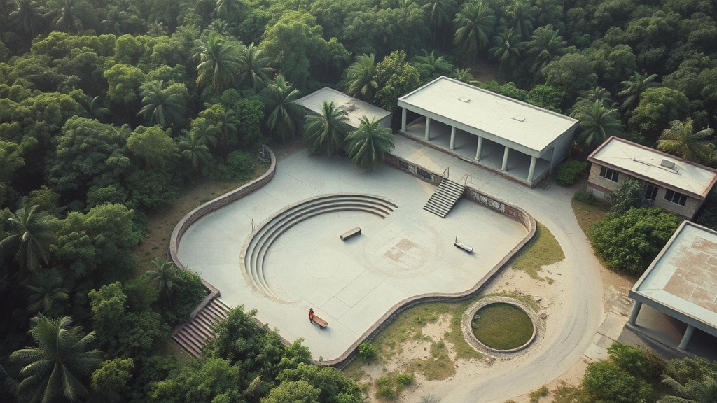 Aerial view of a stark, concrete skatepark embedded within the lush expanse of the Amazon jungle, surrounded by deserted brutalist structures, evoking a deep sense of solitude, captured in the nostalgic style of analog photography with a Leica camera, under the gentle embrace of soft, diffused light.