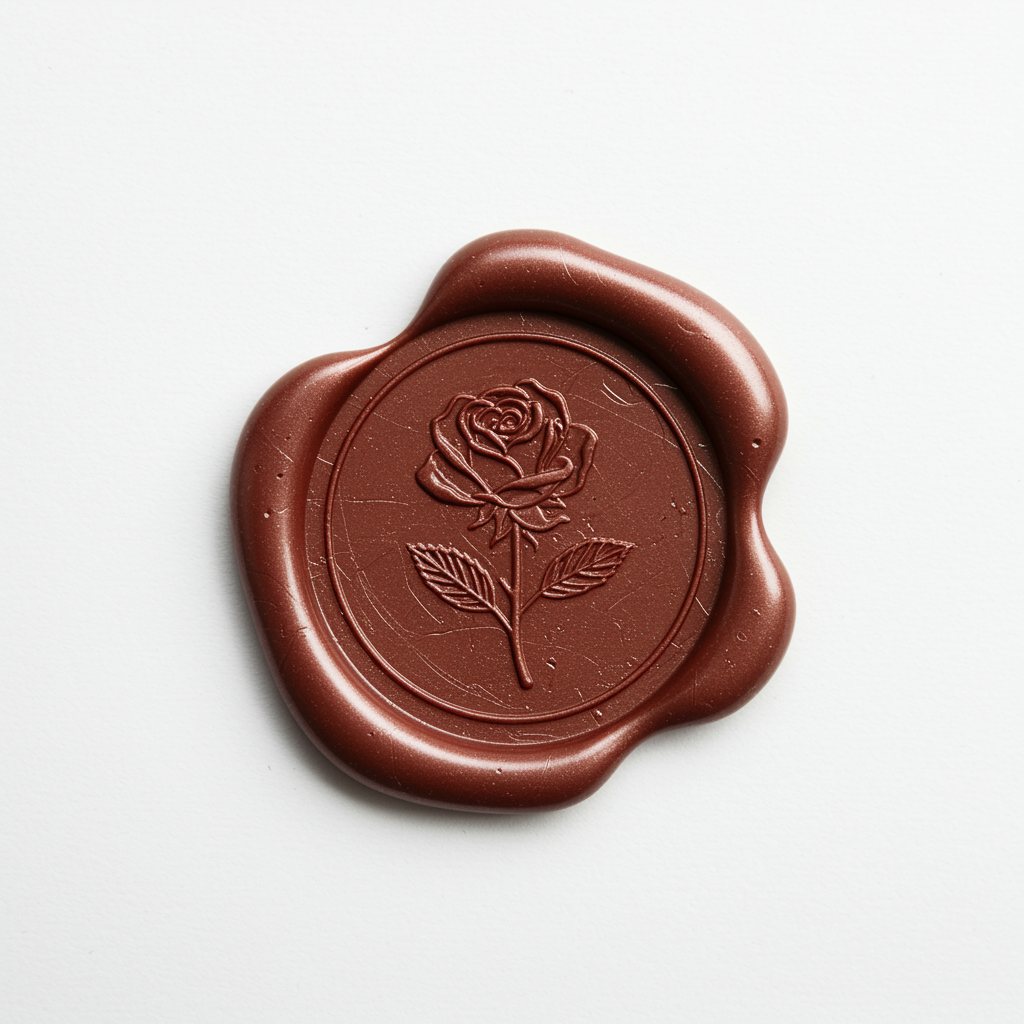 Aerial view of an intricately detailed wax seal featuring a delicate rose, inspired by the styles of Brian Mashburn, Jean-André Rixens, and Marjane Satrapi. The scene is emotionally complex, with a timeless elegance and subtle melancholy. The wax seal stands isolated against a pristine white background, conveying a sense of solitude and contemplation. The composition captures a blend of classic and modern artistic influences from the period 1970 to the present, with an aspect ratio of 73:98. The result is a visually striking and thought-provoking piece that resonates with splendor and introspection.