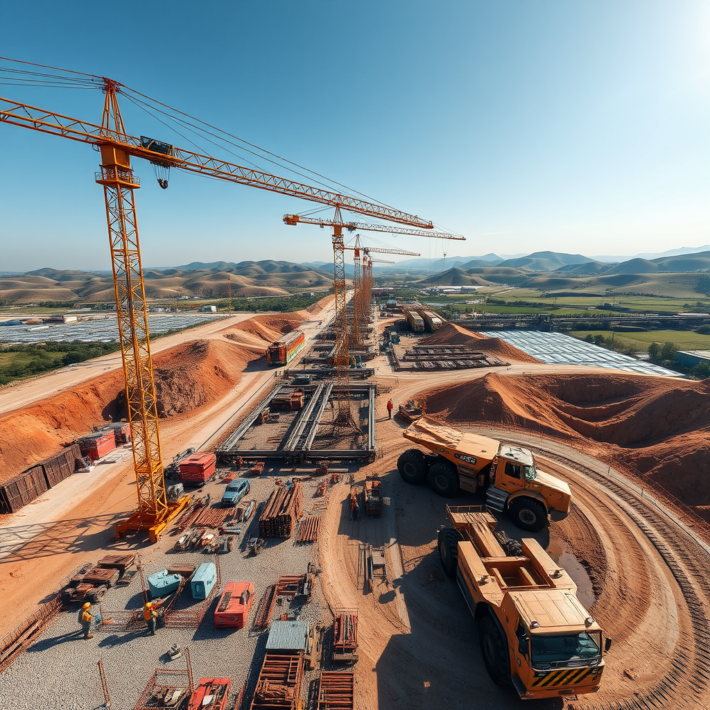 Aerial view of the bustling construction site of the dry port in Drogobich, showcasing cranes lifting steel beams, workers in safety gear coordinating activities, and large earth-moving machinery shaping the landscape, all set against the backdrop of rolling hills under a bright, clear sky.