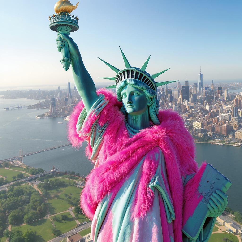 Aerial view of the Statue of Liberty adorned in a vibrant pink fluffy fur coat, captured with high-resolution 8k octane rendering for stunning hyperrealism. The image showcases an exquisitely detailed, ultra-realistic portrait of the iconic monument, set against the backdrop of New York City. Expertly crafted with professional color grading, this commercial-grade photograph highlights the textures and soft hues of the coat, maintaining an aspect ratio of 4:5. Bright sunlight highlights every intricate detail, bringing a fresh, imaginative twist to a timeless symbol.