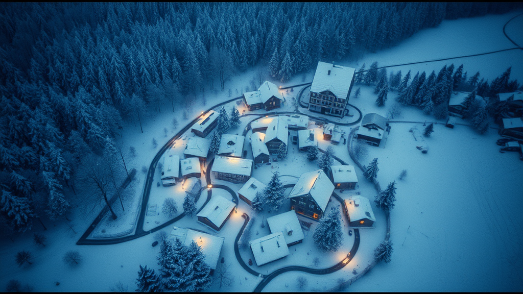 Aerial view photo of a snowy landscape surrounding a quaint village, with a touch of cinematic grain reminiscent of Kodak Portra film, featuring a cozy warm color palette and a softly illuminated ambiance, aspect ratio 4:5.