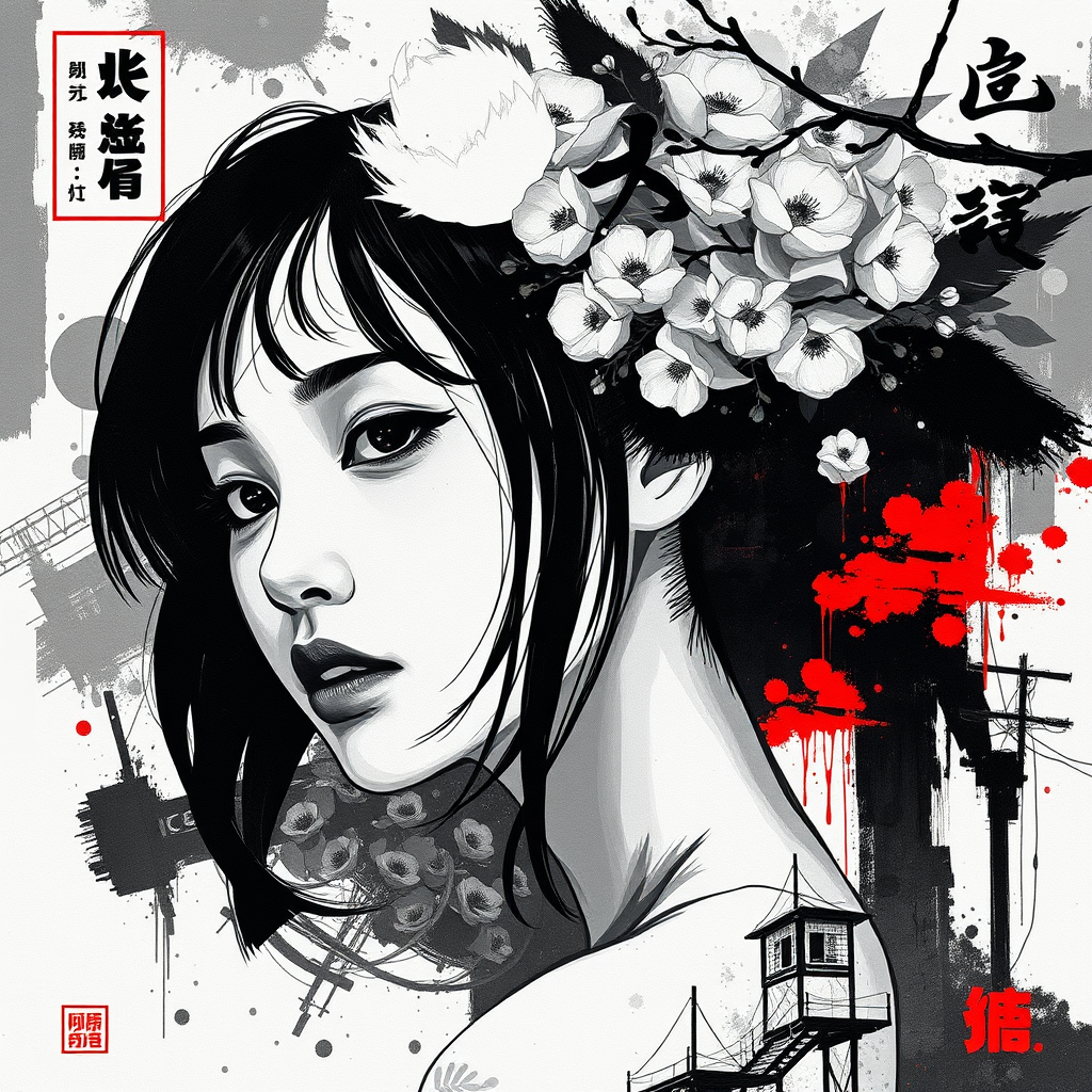 Aesthetic composition in two tones of black and white, featuring simplified yet figurative shapes, merging styles of acrylic painting, watercolor, oil painting, photography, and digital art with dynamic brush strokes. The scene introduces a pop of dark red contrasting with monochrome, showcasing a strikingly beautiful young Asian woman. The artwork is highly detailed, blending ultra-detailed, intricate elements with a low poly, abstract surreal essence. Japanese Kanji and Katakana characters intermingle with niji, graffiti, comics, and anime styles to create a seamless fusion of visual storytelling.
