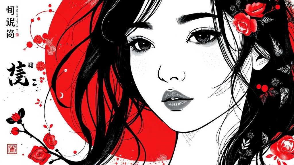 Aesthetic fusion of two-tone black and white simplified shapes with a focus on a gorgeous young Asian girl, blending figurative and abstract elements. Inspired by the styles of acrylic painting, watercolor, oil painting, and photography, incorporating the expressive qualities of digital art and brush strokes. Infuse the artwork with a dark red color pop to contrast the monochrome palette, emphasizing highly detailed and ultra-detailed intricate designs. Incorporate low poly abstraction with surreal elements, intertwining kanji and katakana characters in a niji style, mingling with graffiti, comics, and anime influences to create a unique visual tapestry.