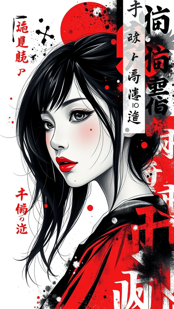 Aesthetic fusion of two-tone black and white with simplified shapes, blending figurative forms in a style merging acrylic, watercolor, and oil painting with elements of photography and digital art. Featuring expressive brush strokes and a striking dark red color pop, the focus is a stunning young Asian girl rendered in high detail. The composition is ultra intricate, integrating low poly abstract surrealism with Kanji and Katakana motifs, enhanced by niji, graffiti, comics, and anime influences for a dynamic visual narrative.