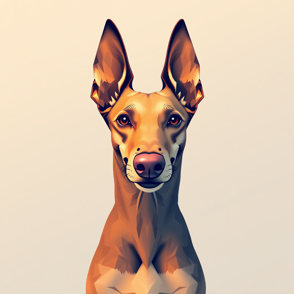 Aesthetic portrait of a Spanish Podenco Dog, symmetrical and lively, digital illustration style, created in Adobe Illustrator, featuring a harmonious blend of warm and cool tones, set against a soft two-color pastel gradient backdrop, capturing the dog's spirited essence subtly enhanced with artistic flair.
