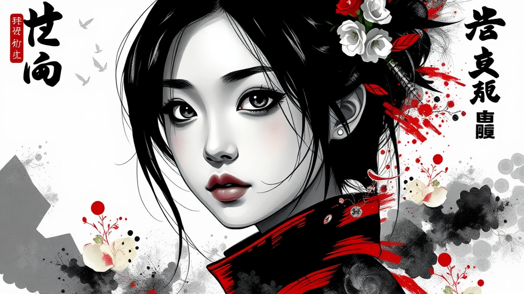 Aesthetic two-tone black and white composition featuring simplified yet intricate shapes, highlighting a gorgeous young Asian girl in a blend of figurative and abstract surrealism. The style merges elements of acrylic, watercolor, and oil painting, enriched with photography and digital art techniques, showcasing dynamic brush strokes and a striking dark red accent. Highly detailed and ultra-detailed, with a fusion of low poly design, Kanji and Katakana script subtly integrated into the background. The piece embodies niji style with graffiti, comic, and anime influences, resulting in an intensely creative and visually captivating portrayal.