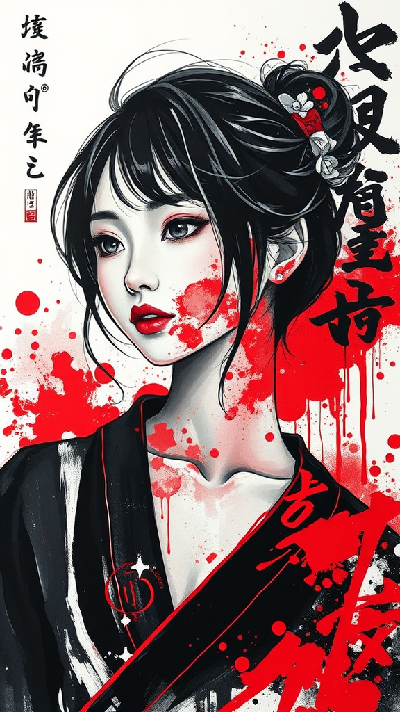 Aesthetic two-tone black and white simplified shapes figurative style blending acrylic painting watercolor oil painting photography digital art with bold brush strokes highlighted by dark red color pop featuring a gorgeous young Asian girl highly detailed ultra intricate low poly abstract surreal elements incorporating Kanji and Katakana infused with niji graffiti comics and anime styles.