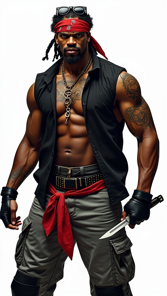 African American. Gang leader, thug. fighter. Hypermasculine male. Tall, muscular, thick built. Dark skinned. Black hair, medium length braids, pulled back and pulled through a red bandana, a pair of dark sunglasses on top of his head. Strong brow and jaw, tiger-colored eyes. Rugged looks. Goatee on face. Mouth full of gold teeth, mixed in with some white ones. An angry sneer on his face. Sleeveless black shirt, open to reveal a tiger's head tattoo on his chest. Black tiger stripe tattoos on his arms and chest. Fingerless black leather biker gloves on his hands. Black leather studded belt around his waist, gray and black camouflage fatigues pants with a red bandana tied around the left leg. Pants are tucked into black leather combat boots, ankle length. He carries a switchblade, ready to use it at any time. Full body pose, fighting stance.