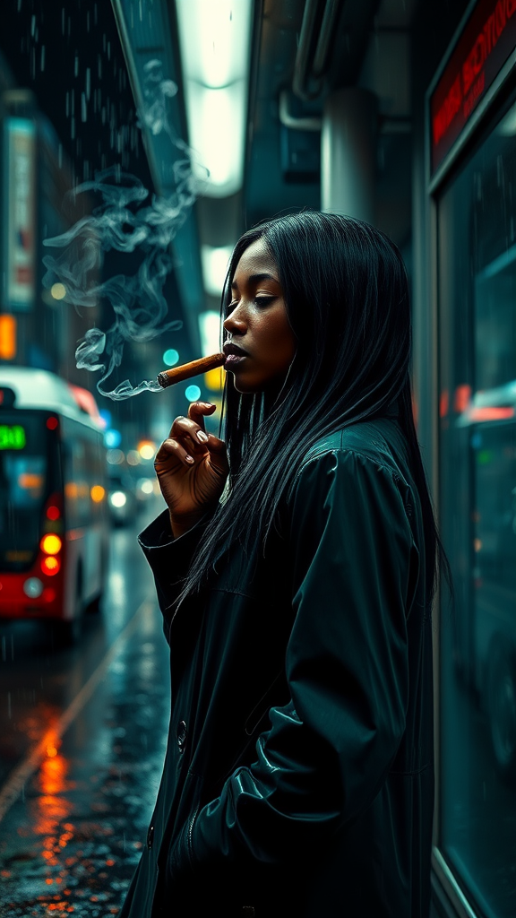 African girl in a stylish raincoat, her long black hair glistening under the raindrops, stands at a dimly lit bus stop in the heart of a bustling night city. Smoke curls up around her, mingling with the rain as she coolly smokes a cigar, her eyes scanning the wet streets for a sign of her ride. The ambiance is a blend of noir and night city allure, the rain casting a shimmering glow around her silhouette, while she waits patiently, exuding an air of mystery and solitude.