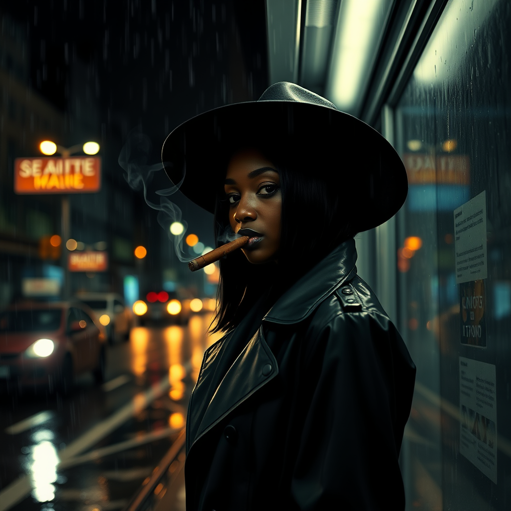 African girl standing at a dimly lit bus stop in the rain-soaked night city, her black hair peeking out from under a wide-brimmed hat, dressed in a sleek raincoat. The night air mingles with the gentle patter of rain as she casually smokes a cigar, wisps of smoke curling up and melting into the dark, noir atmosphere. She's waiting patiently, the city lights reflecting off wet pavement adding a glow around her, creating a mysterious and captivating scene of solitary contemplation.