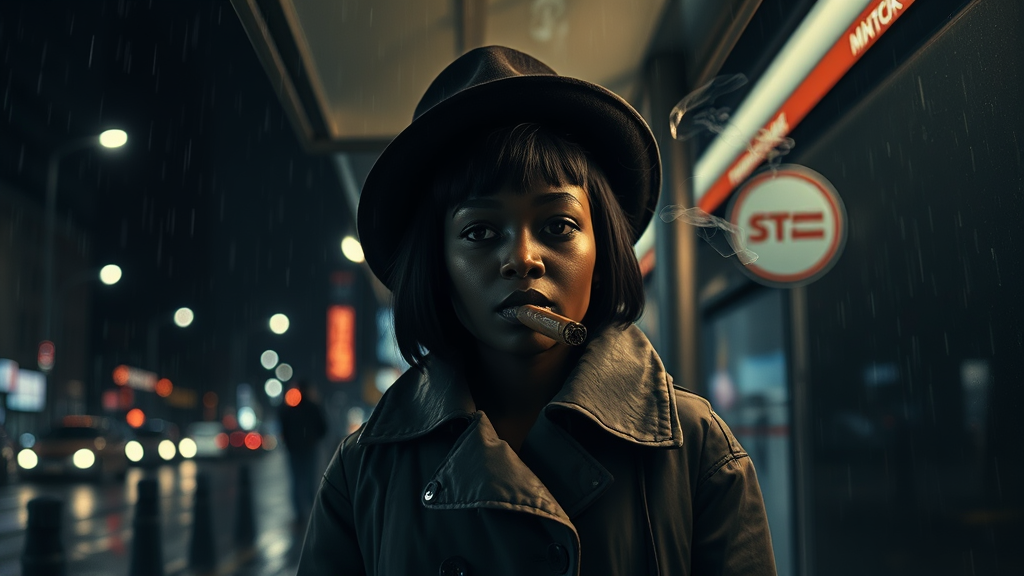 African girl with black hair stands under a bus stop shelter in a night city, wearing a raincoat and hat. Raindrops create a rhythmic pattern around her as she smokes a cigar, the smoke curling upwards, illuminated by dim streetlights. Her eyes are fixed in the distance, waiting with a hint of mystery in the noir ambiance.
