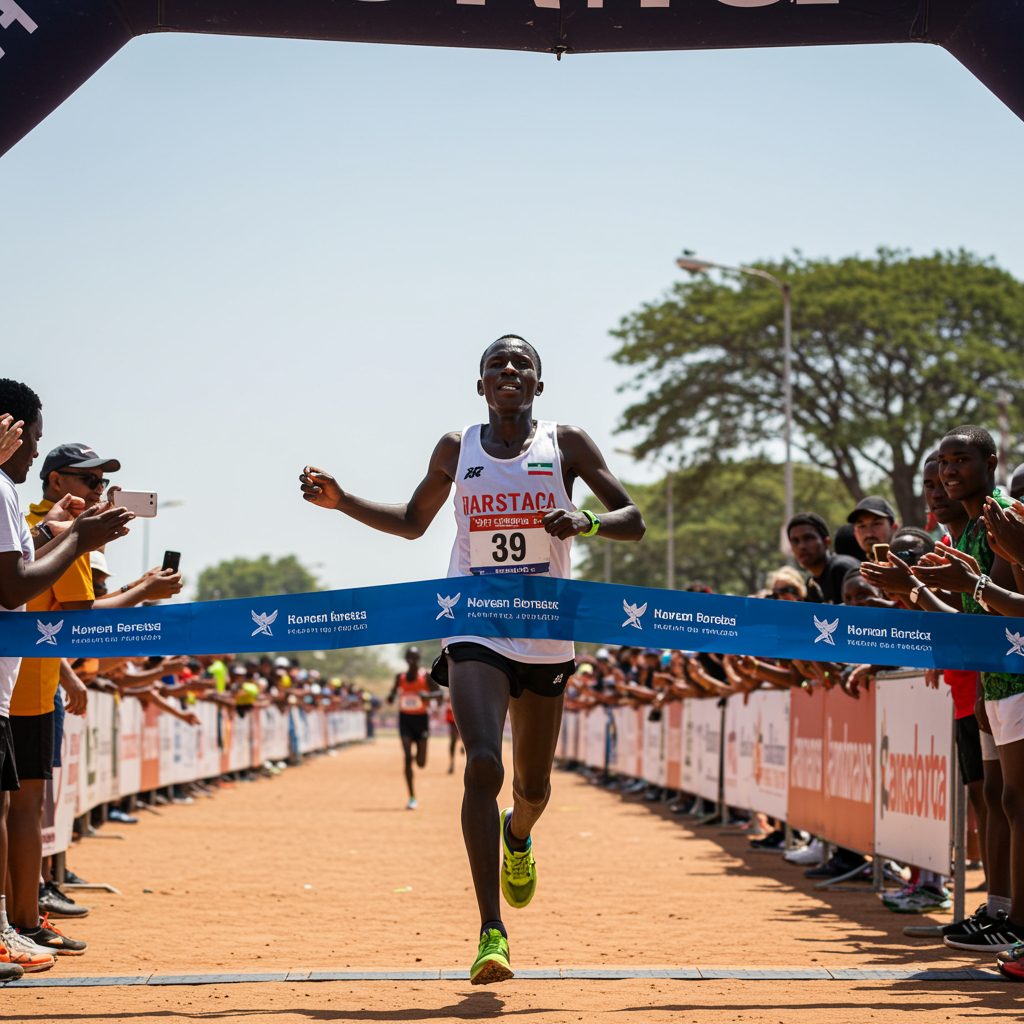A solitary African runner, fatigued yet determined, bursts through the azure finish line ribbon as it flutters around him; his sweat-soaked white jersey clings to his muscular frame under the harsh sun.