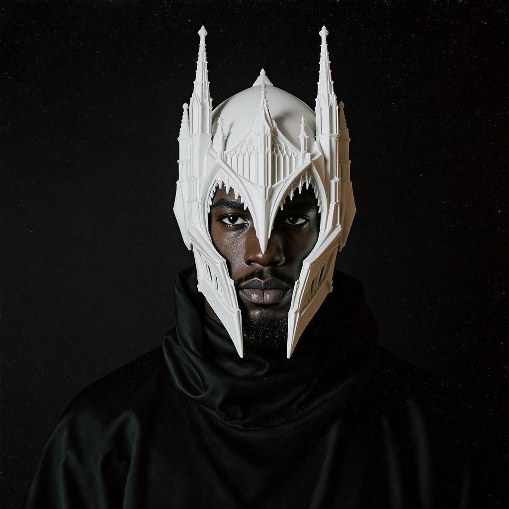 Afro-American man with a latex helmet intricately designed as a white Gothic cathedral, complete with spires and arches, revealing only his eyes. He's dressed in a sleek black neo-futuristic tunic with cascading fabric, embodying an 80s dark fantasy aesthetic. The setting features high-fashion magazine lighting with pronounced highlights and deep shadows, against a simple dark background transitioning with a subtle gradient. The photograph has a retro film vibe with grainy, noisy textures. It is hyperrealistic, captured with a 35mm camera lens in a medium close-up shot that offers natural depth of field.
