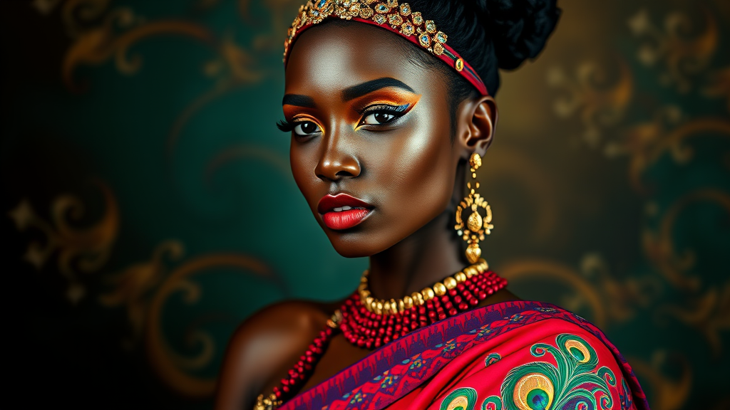 Afrocaribbean model showcasing a vibrant Art Deco peacock gown sari, embodying intricate Art Deco fashion elements, with facial art inspired by Sylvain Chomet's whimsical style. Studio portrait rendered in 8k CGI, blending vivid color theory reminiscent of Team Fortress 2's bold palette and the ethereal beauty of Breath of the Wild, capturing a mesmerizing fusion of elegance and creativity.