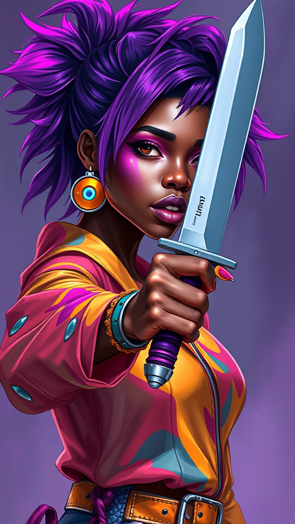 Afrofuturistic woman with bright purple hair and a lively, colorful outfit skillfully holding a sleek knife, showcasing a blend of vibrant realistic colors and a touch of hyper realism, inspired by Rossdraws' stunning cartoon style. The digital painting bursts with energy and creativity through its rich, dark vibrant colors, offering a beautiful and intricate visual experience. This concept art, inspired by vibrant fan art aesthetics, captures a mesmerizing mix of pastels and bold hues in a breathtaking digital artwork, making for an exquisite piece with a distinctive, stunning art style.