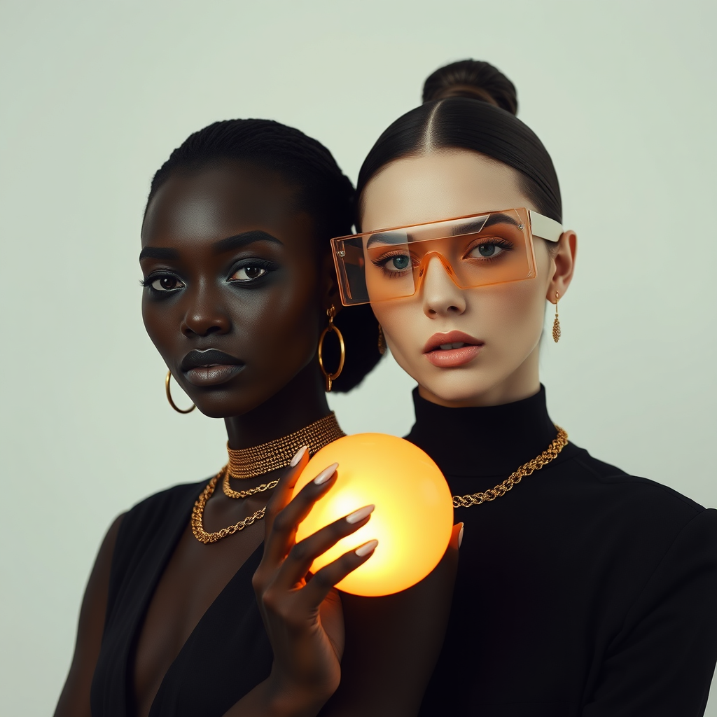 Against a muted matte white backdrop, two women, one with deep ebony skin and the other with porcelain complexion, are adorned in elegant gold jewelry. Their sleek black attire contrasts with a thick neon transparent band and avant-garde eyewear veiling their eyes. This modern and minimalist photoshoot exudes ultimate professionalism, creativity, and art, embodying a new and unknown style reminiscent of Vogue magazine’s distant future—year 2066. The women gently cradle a glowing orb, its warm light casting a serene and mystical aura in the dim surroundings, creating an atmosphere of tranquil sophistication.