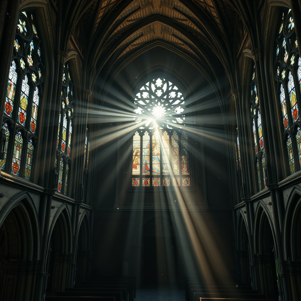 Aged and abandoned ancient cathedral with intricate stained glass windows, god rays streaming through a cracked opening, tiny sharp shards of glass suspended in the air, enhanced by advanced raytracing, RTX reflections, unreal engine, rendered in octane, 4K and 8K resolution, enveloped in mesmerizing volumetric lighting.