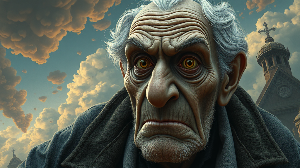 Aged and terrified grandfather with fear-stricken eyes, under a surreal sky inspired by Mundford, baroque maximalist aesthetic, chibi influence by Artificial Nightmares, with touches reminiscent of Stanley Artgerm and Tim Burton, featuring detailed facial features and piercing eyes, extremely detailed and photorealistic, with organic and dynamic elements, ultra-realistic with high definition, showcasing intricate details and crisp quality.
