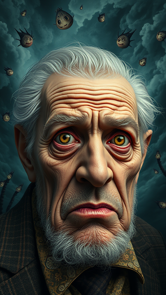 Aged and terrified grandfather with intense fear reflected in his eyes, under a chaotic and surreal sky inspired by Mundford, baroque maximalist. Chibi elements by Artificial Nightmares blend with the whimsical darkness of Tim Burton, vivid face features, piercing eyes, incredibly detailed, photorealistic, highly intricate, lifelike, vibrant realism, crisp and dynamic presentation, organic flair, ultra high definition, showcasing complexity and depth with masterful precision.