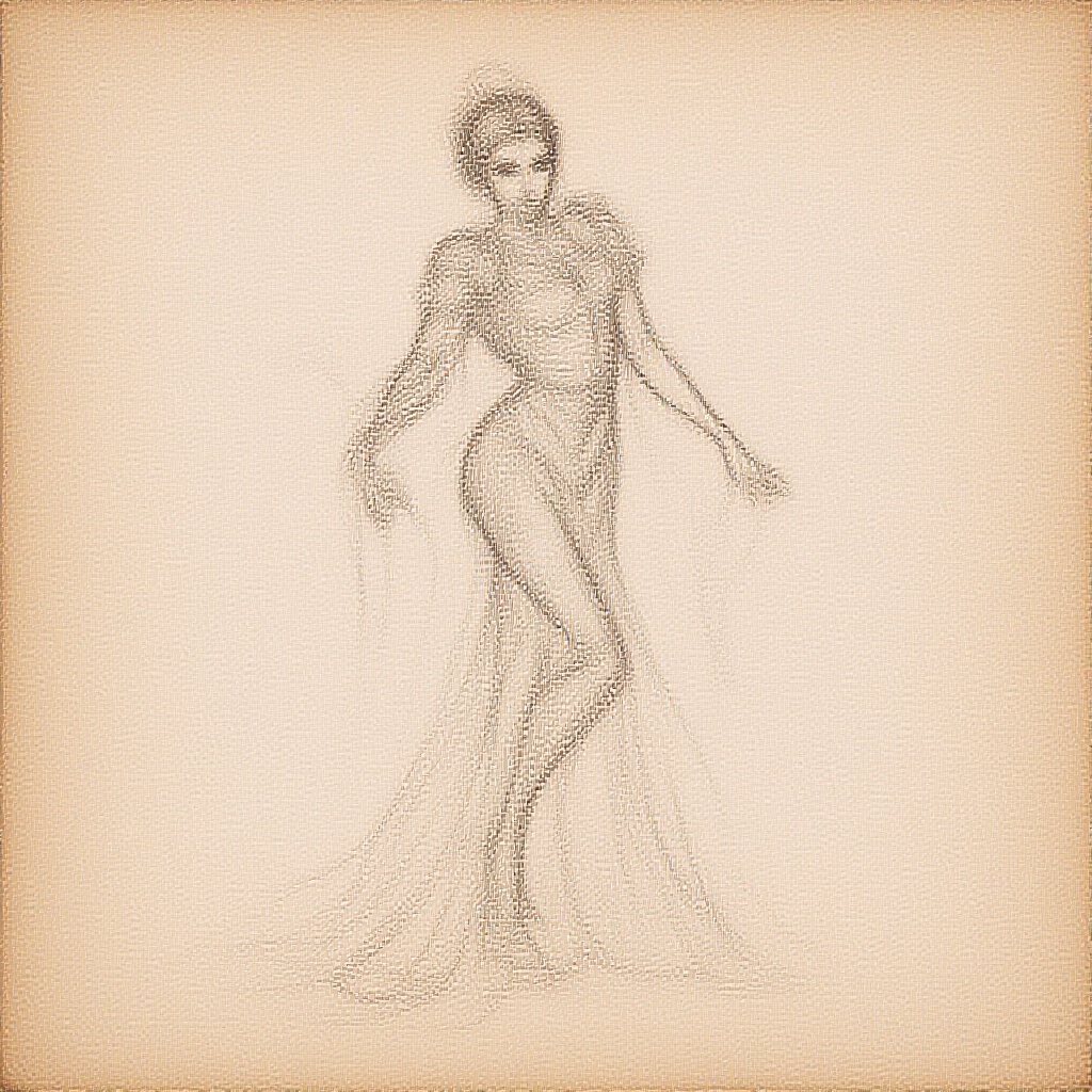 Aged parchment showcasing a rough charcoal sketch of an elegant female form in an alluring stance, defined by crisp line work, balancing classic allure with artistic sophistication, accentuating textures and mood with subtle innovations.