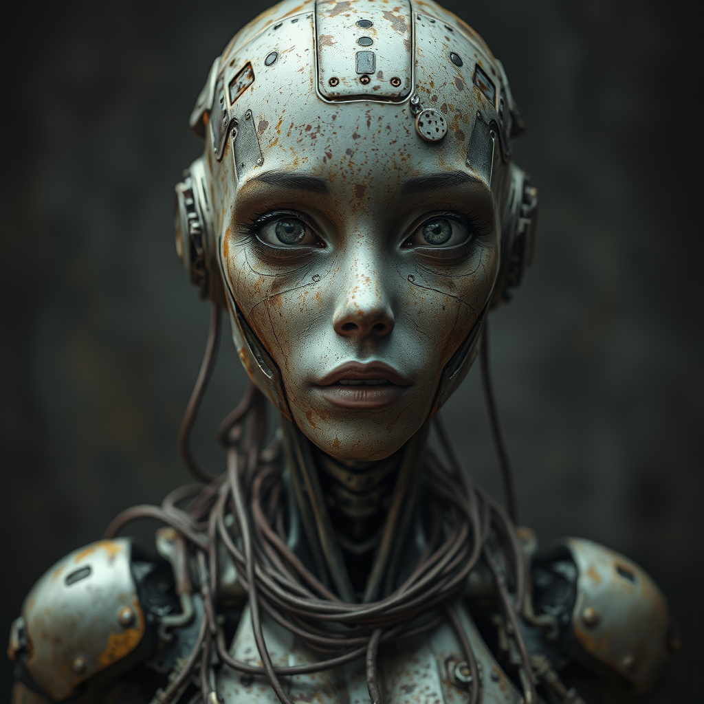 Aging female robot, with timeworn metal and visible rust, exposed wires trailing from her form, appearing damaged and forlorn. Her eyes meet yours in a darkened, grimy setting. Captured in a portrait photography style that emphasizes the intricacy of her weathered skin, realistic and photo-realistic, rendered in high-resolution 8k with hyper-detailed precision. The frame captures her full length with a sharp focus, enveloped in diffused, soft lighting that creates a shallow depth of field, embodying hyperrealism. Conceptualized with cinematic CGI lighting, emphasizing her low resolution qualities with intentional imperfections. Text distortion and cropped areas introduce an eerie, distorted quality to the image. Her anatomy is presented in flawed dimensions, with elements like misshaped faces, cloned features, and elongated necks. Limbs are either missing or oddly duplicated, portraying a malformed, yet captivating figure devoid of signatures or watermarks. The composition is unsettling, yet deeply engaging, echoing themes of decay and wear.