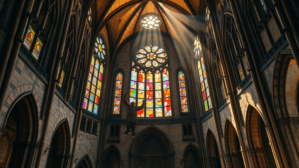 Aging, time-worn ancient cathedral with an air of mystery; weathered stained glass windows shedding colorful fragments, god rays streaming through a gaping aperture, casting scattered shards like sparkling stars, advanced ray tracing highlights, with RTX quality reflections; an unreal, mesmerizing spectacle as volumetric lighting reveals dust motes dancing in the air, filmed in breathtaking 4K and 8K resolution.