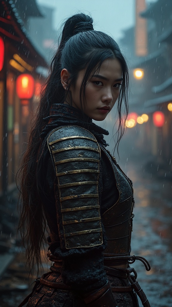 A breathtaking 12th-century young Asian female samurai portrayed in the style of Greg Rutkowski; she dons intricately detailed samurai armor that complements her strikingly beautiful face. The scene is set in a dimly lit, rain-soaked cityscape that enhances the cinematic feel through dramatic lighting and rich lumen reflections. The environment is stunning, captured through a wide-angle lens that emphasizes hyperrealism and depth of field, showcasing an insanely detailed and immersive atmosphere.