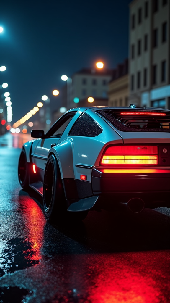A futuristic 1984 Nissan 300zx featuring a sleek wide body adorned with aerodynamic vents, custom LED tail lights, and carbon fiber detailing that enhances its modern aesthetic. The vehicle is captured in RAW using a Canon D500 on Portra 200 film, highlighting its glossy paintwork and intricate design elements. The image portrays the car under an urban nightscape, where the additional neon underglow subtly illuminates the asphalt while reflections enhance the smooth curves of the body. The scene is completed with minimalist, almost invisible side mirrors and a panoramic roof that adds a contemporary twist to the classic design.