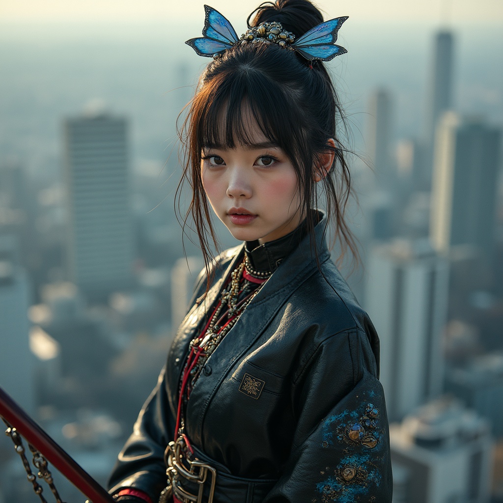 View this AI-generated image featuring 30 year old japanese beauty atompunk theme full body image high angle cinematic shot centered composition richly detailed futuristic attire and accessories seamlessly blending traditional and modern aesthetics dramatic lighting urban skyline backdrop capturing
