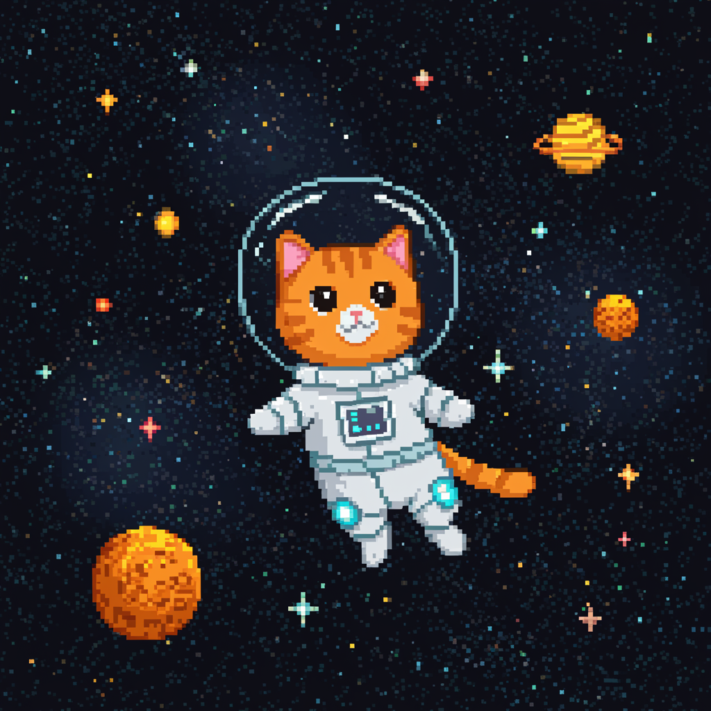 Adorable feline in a futuristic space suit, floating through the cosmos as pixel art, surrounded by twinkling stars and small planets, with a playful and whimsical touch.