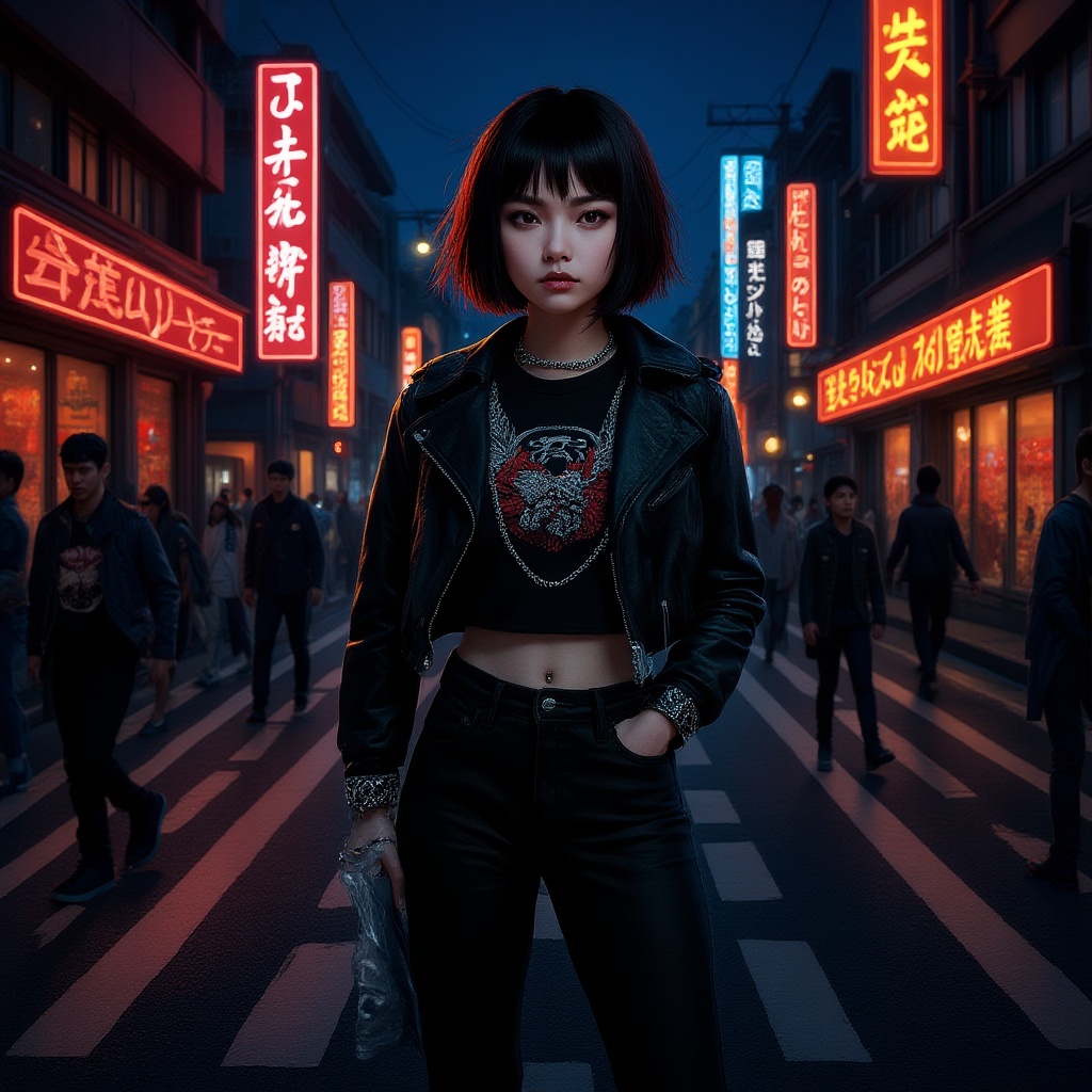 View this AI-generated image featuring a girl adorned in elaborate streetwear stands poised in the neon lit streets of tokyo her presence striking under the synthetic glow the scene captures intricate details with breathtaking beauty characterized by precise linework and vibrant colors emulating the