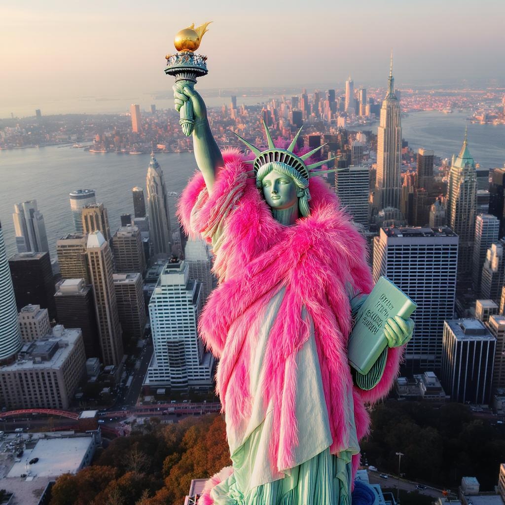 Aerial view of the Statue of Liberty draped in an extravagant pink fluffy fur coat, captured in stunning 8k octane rendering, high resolution photography. The scene embraces hyperrealism with insanely detailed textures and features, showcasing ultra realistic commercial photography aesthetics. The statue majestically blends into the vibrant New York skyline, adorned with professional color grading, while the scene captures the essence of grandeur and elegance in a 4:5 aspect ratio. Subtle hints of a golden sunset illuminate the fur, adding a touch of warmth to the iconic symbol of freedom.