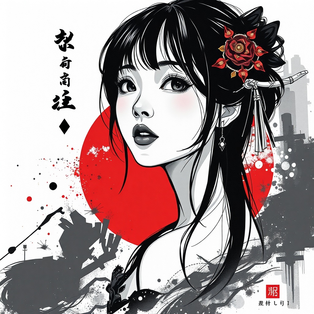 View this AI-generated image featuring aesthetic two tone black and white simplified shapes featuring a gorgeous young asian girl blending a style mix of acrylic painting watercolor and oil painting with photography and digital art elements incorporate expressive brush strokes with a dark red color