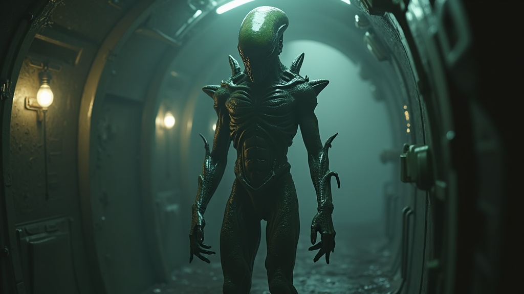 View this AI-generated image featuring an eerie and unsettling alien creature stands prominently with its intricate and bizarre alien skin and attire in a damp steamy highly detailed spaceship corridor the sci fi scene is illuminated by flickering halogen lamps bathing everything in muted dark color