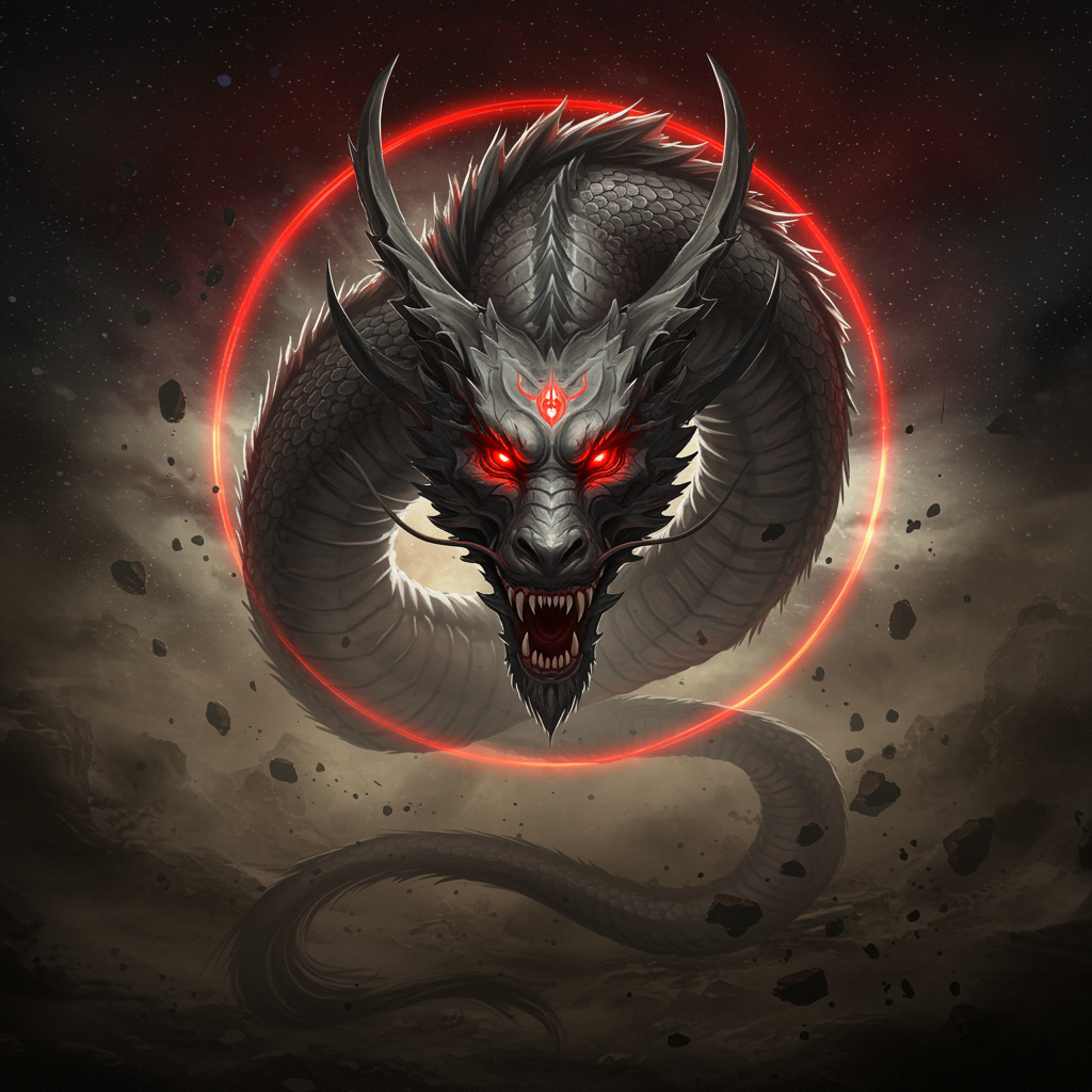 View this AI-generated image featuring an imposing and magnificent ancient chinese space dragon roaming the universe with the grandeur of balerion the dread embodying the essence of the one true dragon god its eyes blaze crimson red filled with bloodlust contrasted against its gray scales the full b