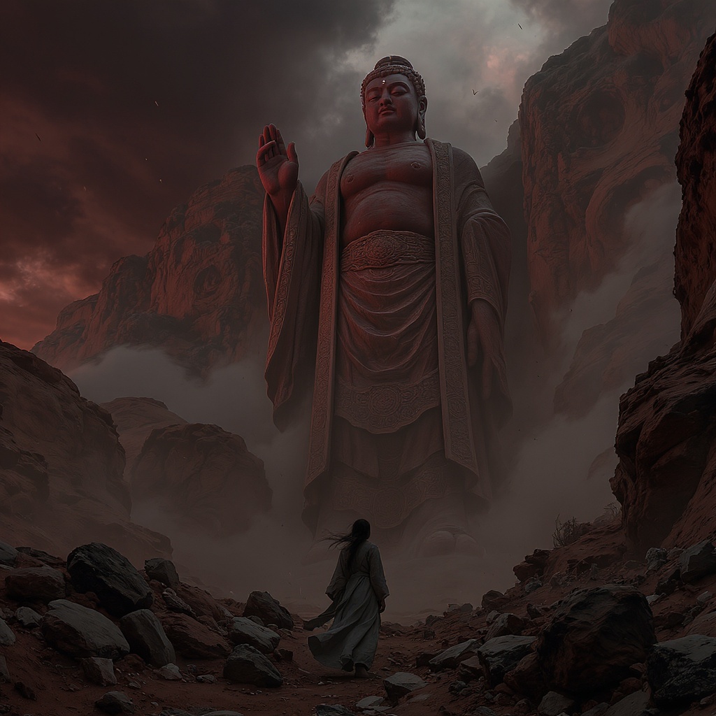 A towering ancient statue stands majestically amidst the rugged, undulating terrain of northern China, its intricate details brought to life in hyper-realistic engine style. A solitary woman gazes up at the colossal figure, her eyes wide with wonder and reverence. The scene is bathed in a dramatic palette of deep reds and cool grays, evoking a sense of timelessness and mysticism. The high-speed sync effect captures the motion of swirling dust, casting ephemeral shadows upon piles of weathered stone around the base of the statue. The atmosphere is suffused with a traditional essence, the statue's rich cultural heritage interwoven with the natural landscape, creating a cinematic moment frozen in time.