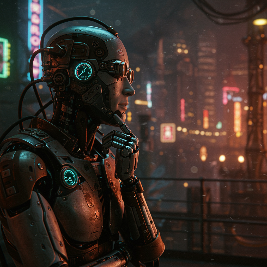 View this AI-generated image featuring a cyberpunk android gazes thoughtfully at the horizon of a looming apocalypse seamlessly blending elements of steampunk design with intricate metallic gears and gauges set within a cinematic focus the scene is rendered with the striking detail of an octane rend